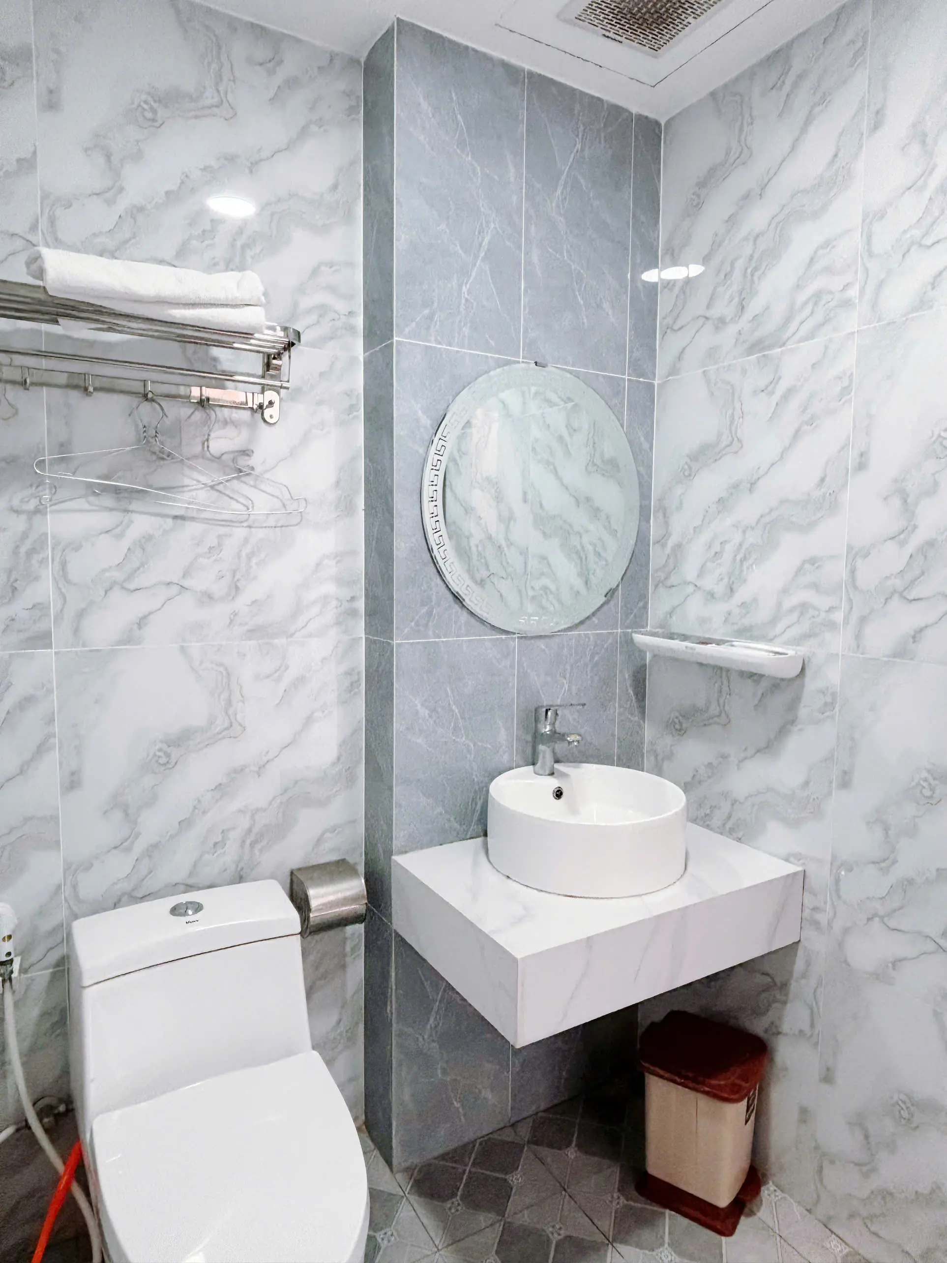 Phòng tắm sang trọng: Khu vực vệ sinh riêng biệt với thiết kế ốp đá marble cao cấp, sen tắm đứng hiện đại và đầy đủ đồ dùng cá nhân sạch sẽ.